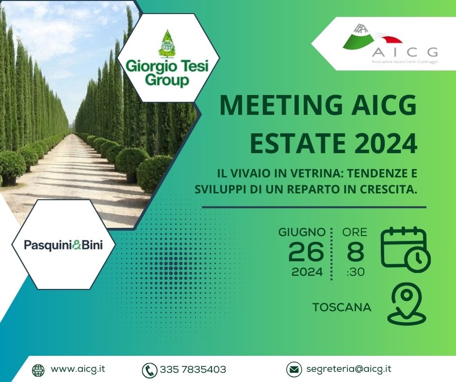 Mercoledì 26 giugno 2024 si terrà il Meeting Estivo AICG, organizzato in collaborazione con Pasquini & Bini e Giorgio Tesi Group, dal titolo "Il vivaio in vetrina: tendenze e sviluppi di un reparto in crescita", riservato ai Soci Ordinari (centri di giardinaggio) AICG.
