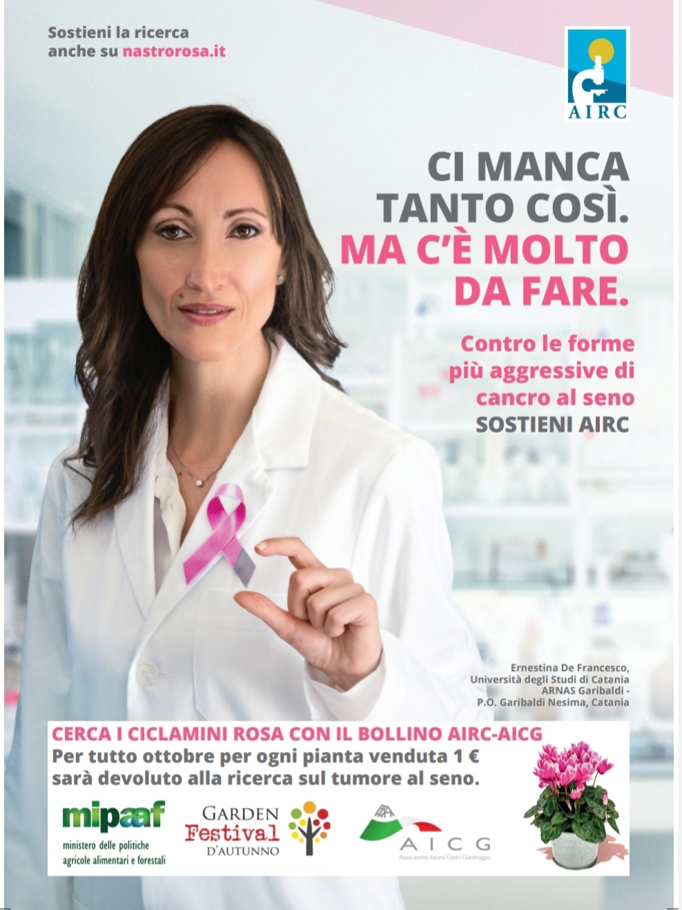 Anche quest’anno, infatti, AICG prosegue la collaborazione con AIRC (Associazione Italiana Ricerca sul Cancro) aderendo alla Campagna Nastro Rosa: per tutto il mese di ottobre per ogni vaso di ciclamino di colore rosa venduto nei Centri Giardinaggio aderenti verrà devoluto 1 euro a sostegno della ricerca contro il cancro al seno.