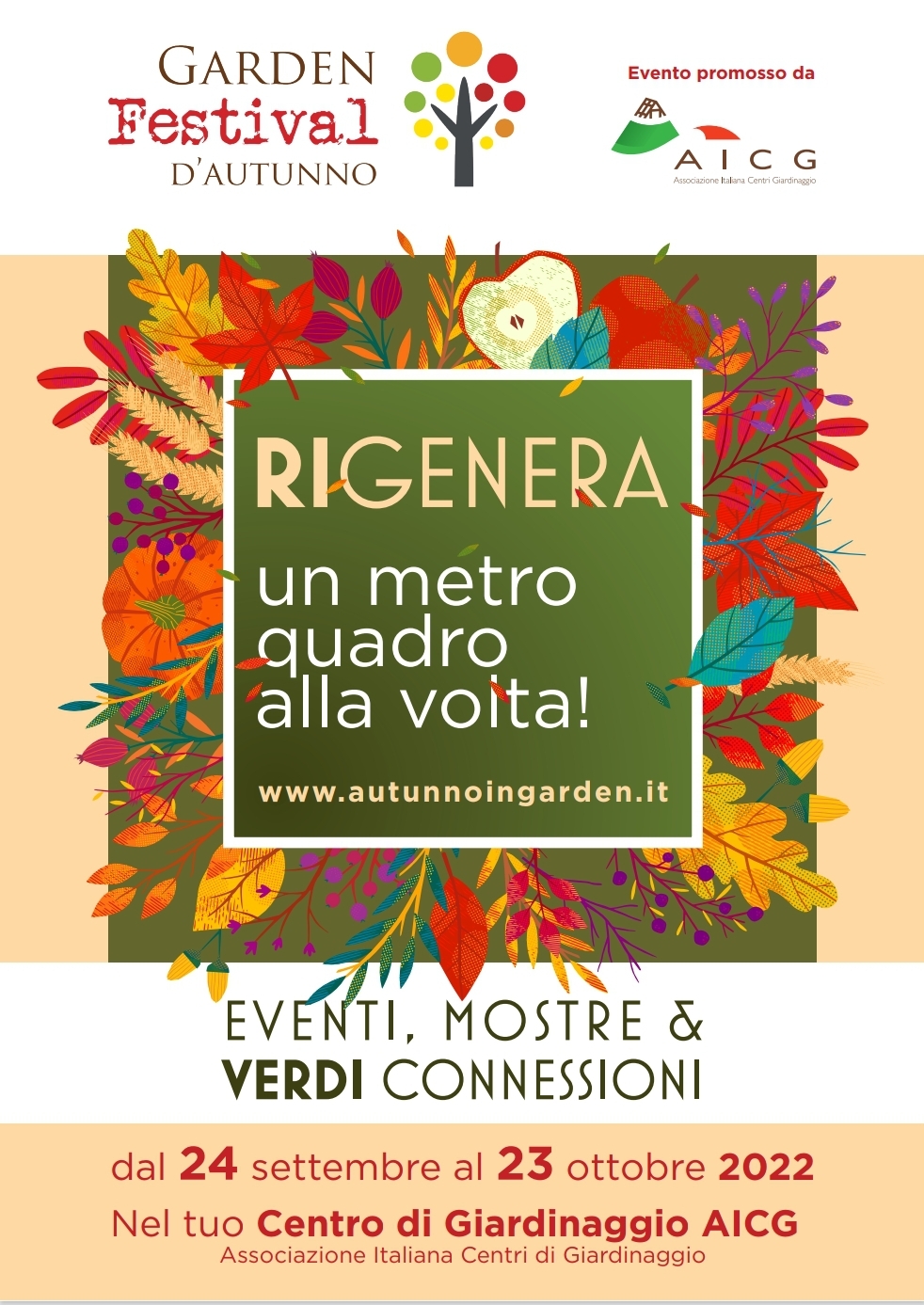 L’edizione 2022, la settima, del Garden Festival d’Autunno – promosso da AICG Associazione Italiana Centri Giardinaggio nei Garden Center aderenti di tutta Italia – quest’anno intende far riflettere sul significato di rigenerare: un invito all’azione, abbinato a una unità di misura piccola e precisa - un metro quadro - da far rinascere poco alla volta con azioni semplici e realizzabili.